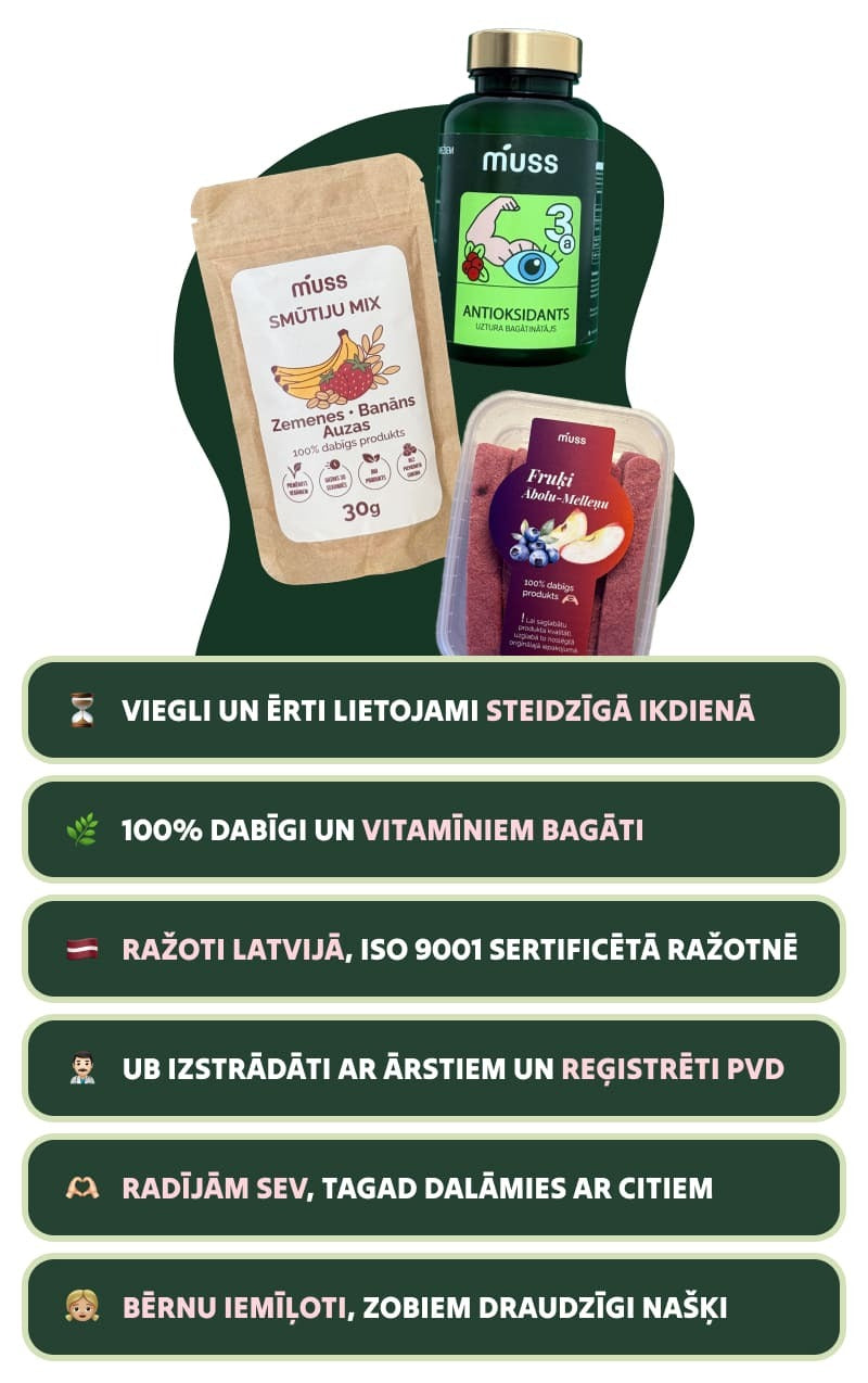 Brīnišķīgs našķis, paldies! Nu vitamīnus varam uzņemt visu cauru gadu. Mums Muss produkti iet uz urrā!🤤