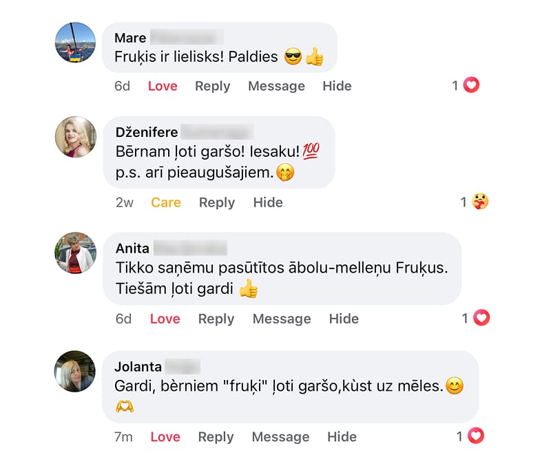 "Super, ka bērni domā, ka tās reāli ir konfektes. Apēd un prasa vēl. Man kā vecākam ir miers, jo zinu, ka fruķis ir dabīgs un pilns ar vitamīniem, nevis kārtējais draņķis.”